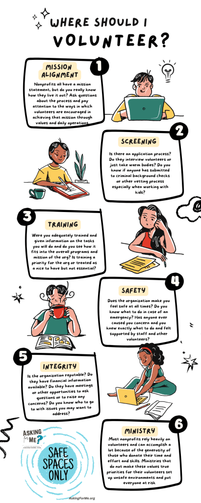 Is there an application process? Do they interview volunteers or just take warm bodies? Do you know if anyone has submitted to criminal background checks or other vetting process especially when working with kids? How will you feel safe with others? If they didn’t screen or interview you, do you think they do for others?