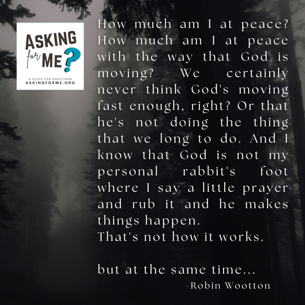 Now that’s not to say that I’m not suffering. Please don’t hear me say that I’m ranking who gets to suffer. I’m not doing that at all. There are certainly days when I realize how much my husband has suffered, how much we have suffered together, and it breaks my heart. I’m just undone by it. And then I do this thing in my head before God. How much am I at peace? How much am I at peace with the way that God is moving? We certainly never think God’s moving fast enough, right? Or that he’s not doing the thing that we long do. And I know that God is not my personal rabbit’s foot where I say a little prayer and rub it and he makes things happen.