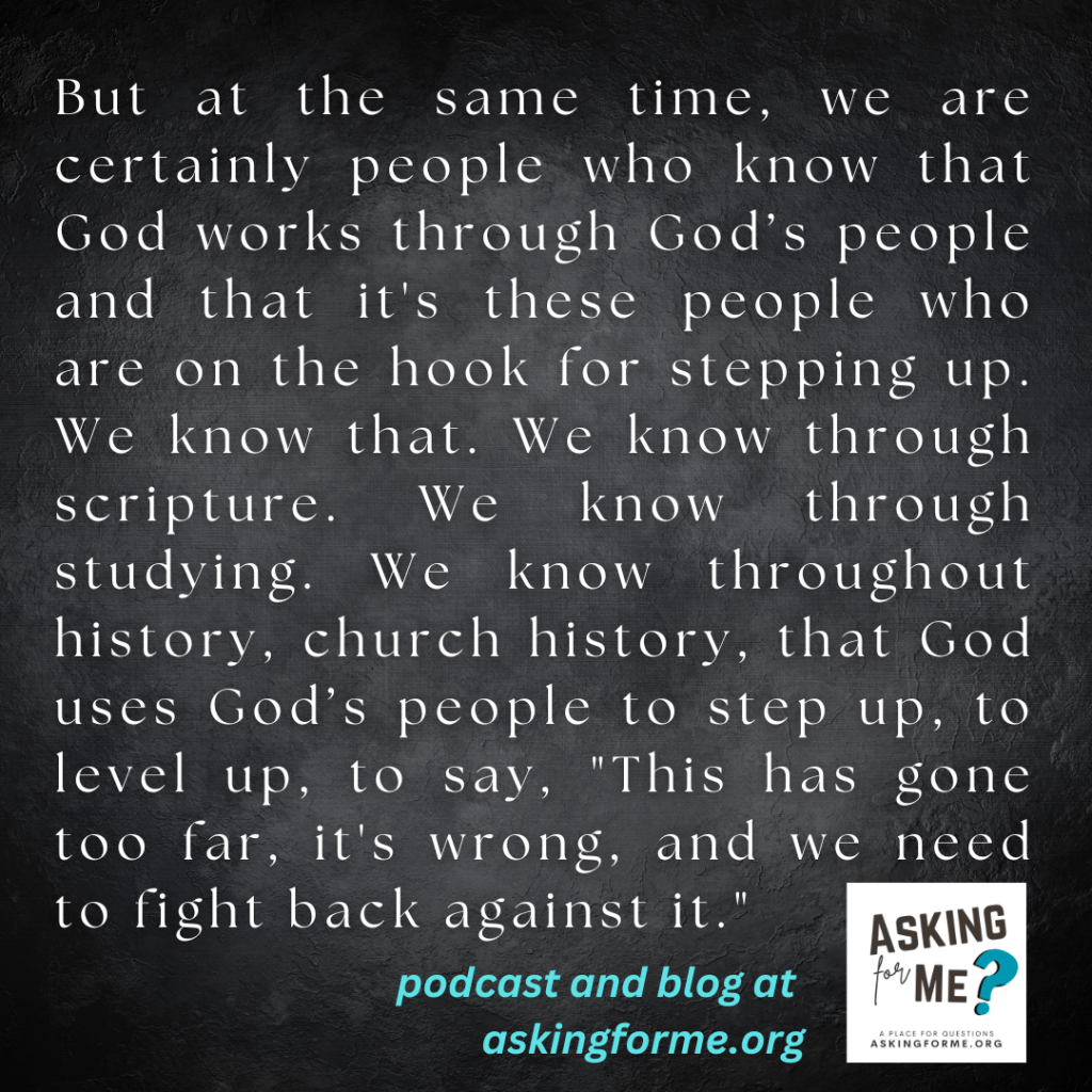 That’s not how it works. But at the same time, we are certainly people who know that God works through his people and that it’s his people who are on the hook for stepping up. We know that. We know through scripture. We know through studying. We know throughout history, church history, that God uses his people to step up, to level up, to say, “This has gone too far, it’s wrong, and we need to fight back against it.”